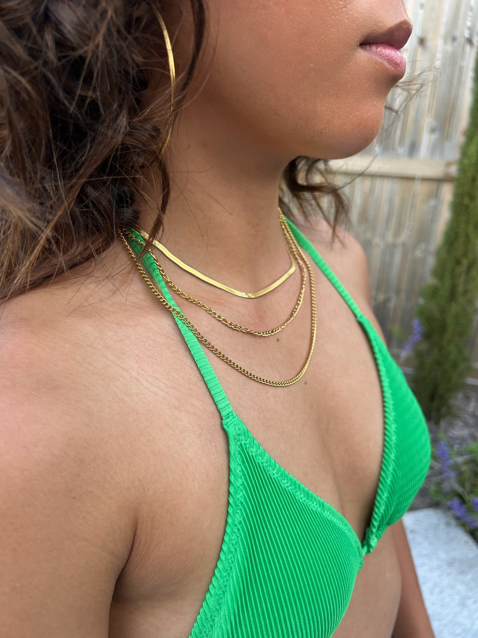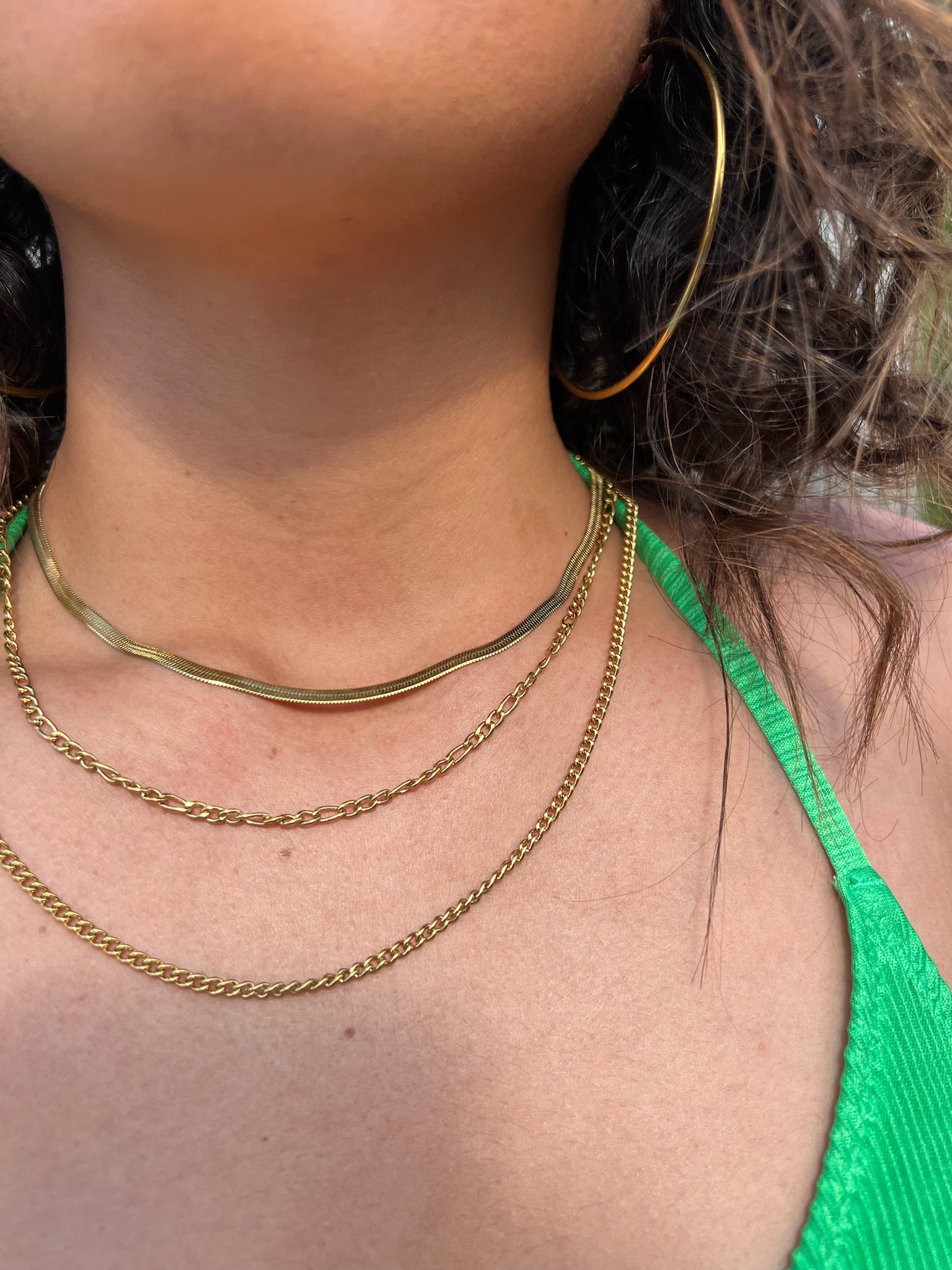 • The Herringbone: A sleek, flat-snake chain that sits highest on the neckline, catching the light with a liquid-like gold finish.