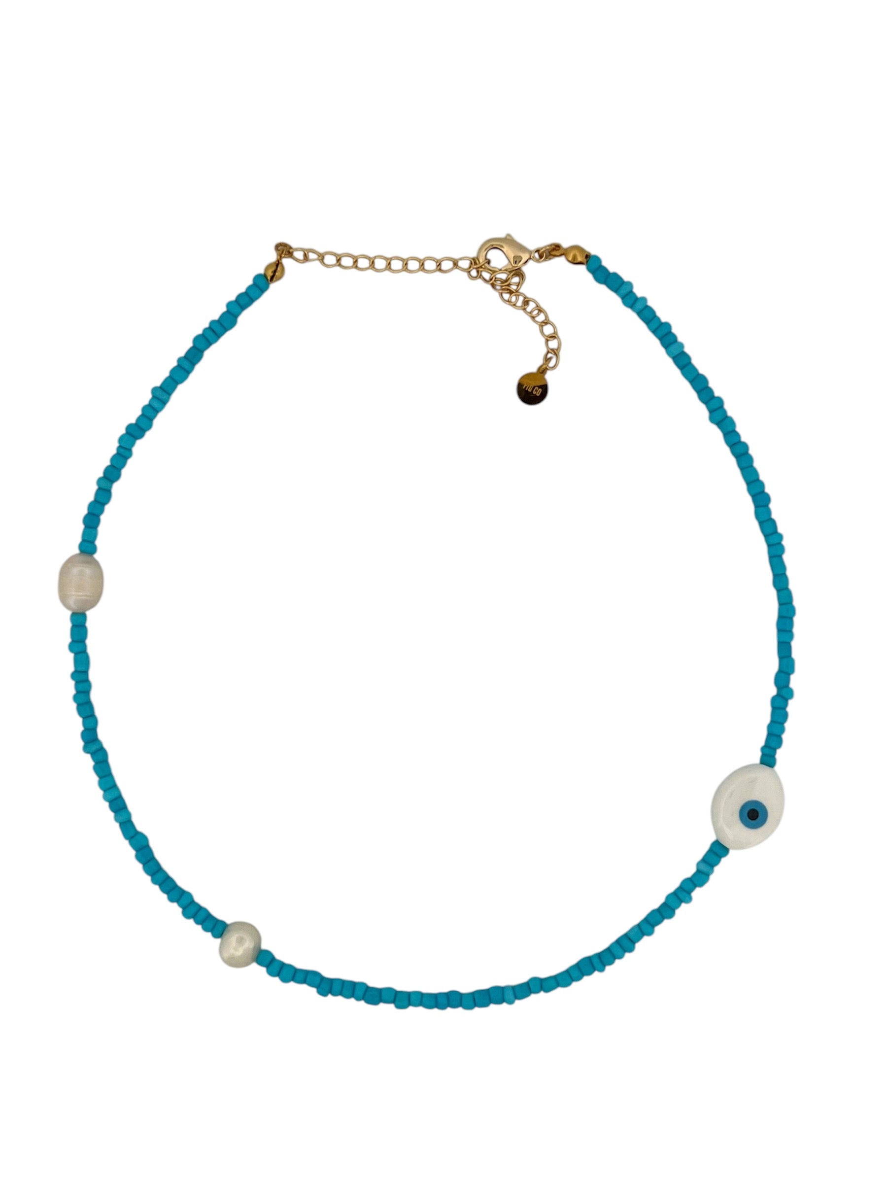 The Clio Necklace is a radiant piece designed to evoke the warmth and beauty of summer. Handcrafted with precision, it features light aqua seed beads that shimmer like the ocean, interspersed with lustrous freshwater pearls and a ceramic evil eye bead for a touch of mystical charm. Finished with 14k gold-plated findings, this necklace exudes effortless elegance and is a perfect reminder of sunny days on the coast. Each piece is carefully made in our Sunshine Coast workshop, bringing a piece of the serene coastline into your everyday style.