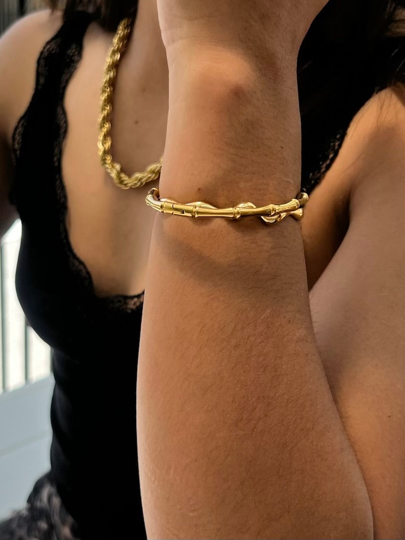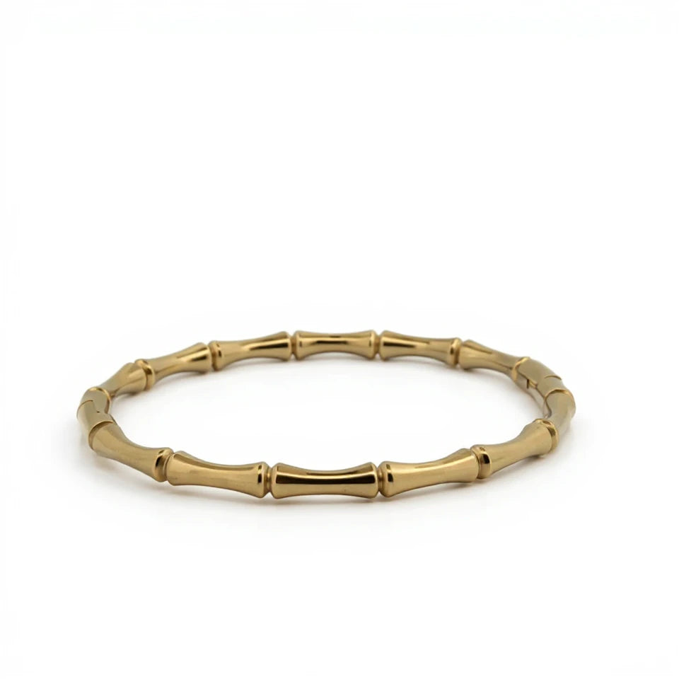 Meet the perfect blend of minimalism and organic design. This gold-plated bracelet features smooth, sculpted bamboo-inspired links that wrap effortlessly around the wrist. Finished with a discreet clasp for easy wear, it offers the beauty of a bangle with the flexibility of a fitted bracelet. One size fits most.
